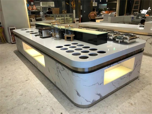 布菲台在星级酒店的应用非常的多,酒店餐厅布菲台材质主要是人造石、大理石、亚克力、木材、不锈钢等供选择。
